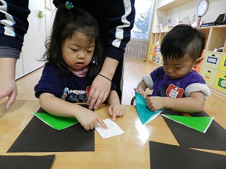 キラキラした折り紙を貼ってプレゼントボックスの出来上がり!