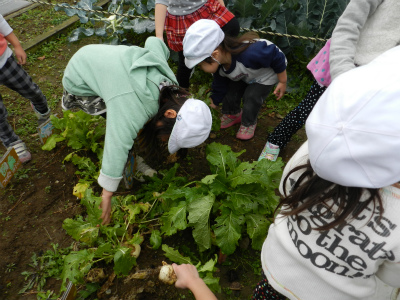 しょくぱんまんグループはみんなで植えたカブが畑でどんどん育っていたので今日みんなで収穫しました。