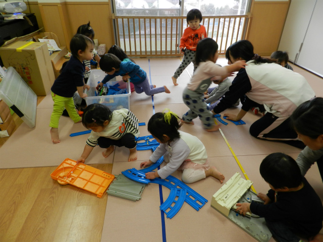 みんなでレールを長くつなげ、うれしそうにしているお友達もいました!(^^)!