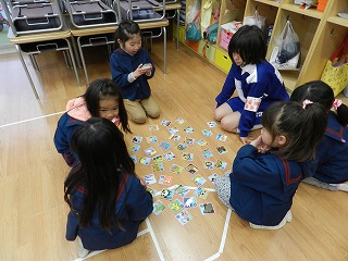 ぬりえをしてそれを使ってカルタをしたり、絵本を読んだり0歳から5歳までが同じクラスですごしました。