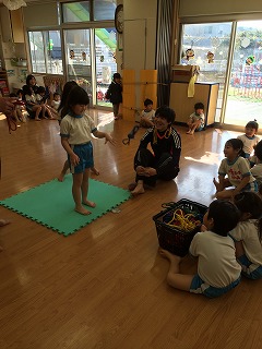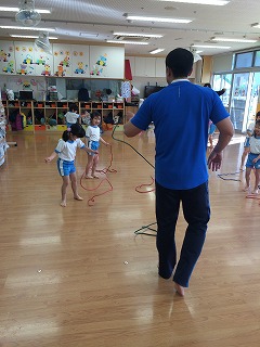 遠くにあるなわとびが入っていたかごに投げて入れていました(^O^)