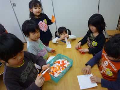 キリン組さんは折り紙を小さくちぎってみんなで集めています。