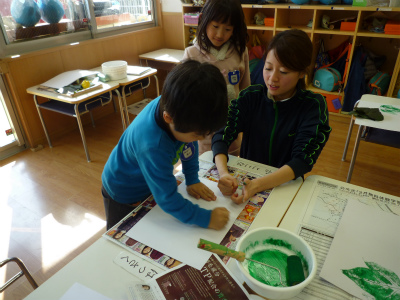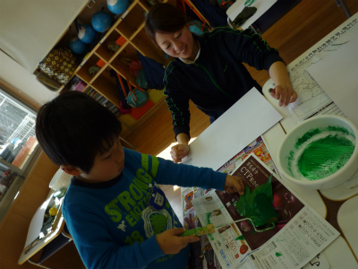 絵の具をつけたら白い画用紙をのせて上からこすります。