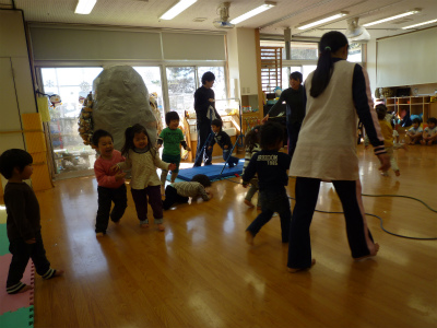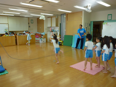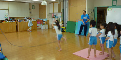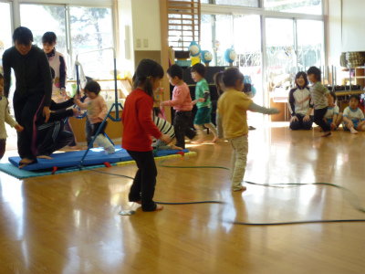 ニコニコ笑いながら蛇にみたてた縄跳びを飛び越えていきました。