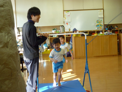 ライオン組さんは慣れた様子で大縄や鉄棒をくぐっていきウォーミングアップをしているかのようです。