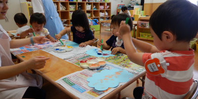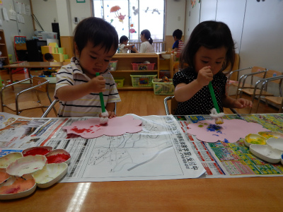 5月に製作したカタツムリと合わせて、可愛い壁面ができましたよ!(^^)!
