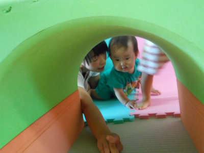 トンネルに夢中になって遊んでいる子もいます!