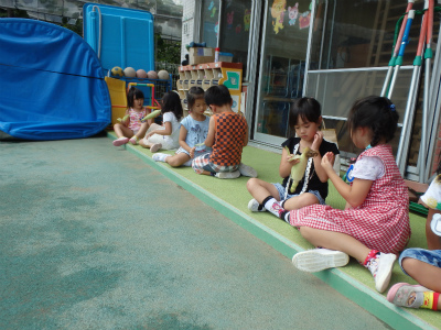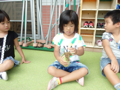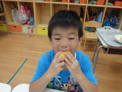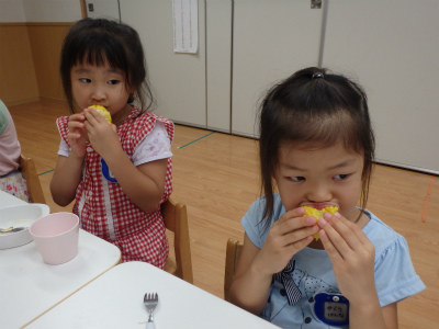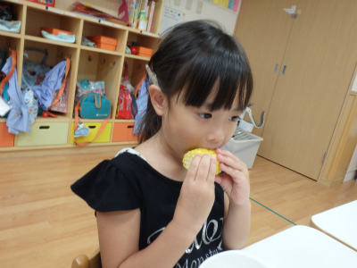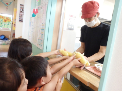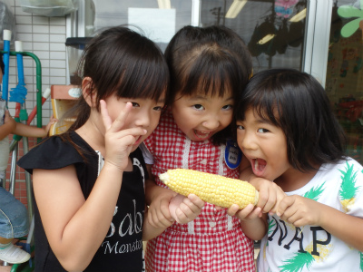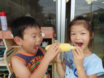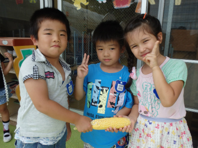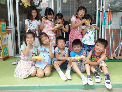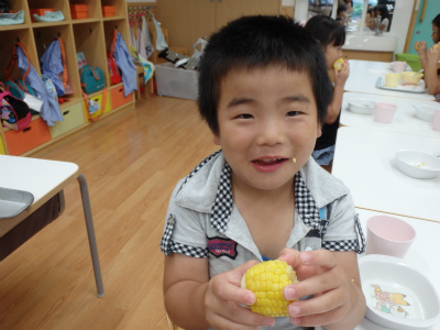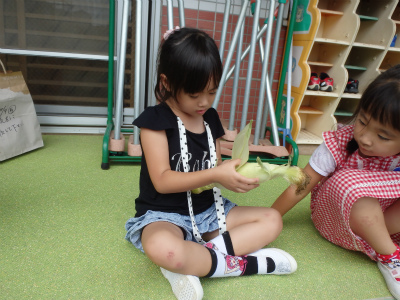 5歳児のライオン組さんは、トウモロコシの皮むきを