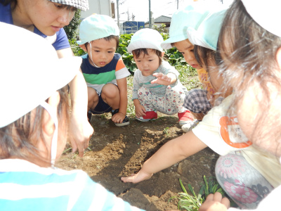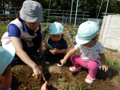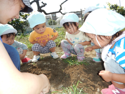 1歳児ペンギン組さんでは、畑に大根の種を