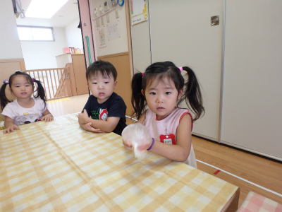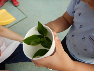 2歳児イルカ組さんでは、昨日のお散歩で摘んできた
