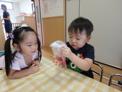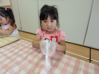 オシロイバナを袋に入れて水を注ぎ色水を作りました♡