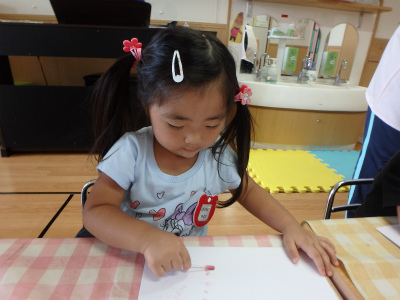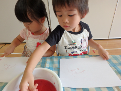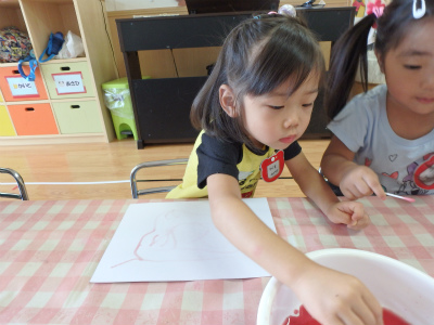 出来た色水で綿棒を使って絵を描きました(*^^)v