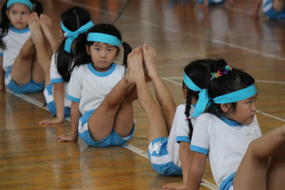 準備体操の「一等賞体操」では、年長ライオン組の代表の子ども