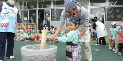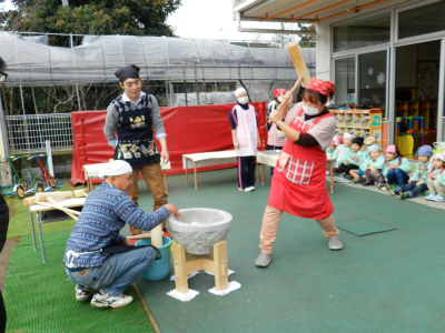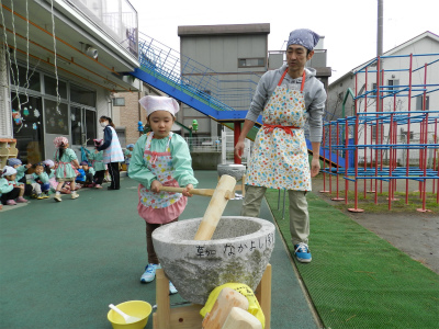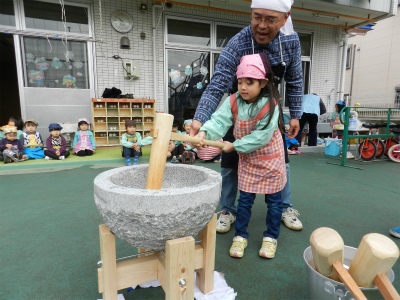 「お餅つきってね、思い切りつかないとお餅にならないんだよ!」