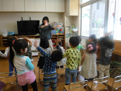 ゆりこ先生に名前を呼ばれると英語で返事をして