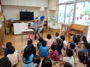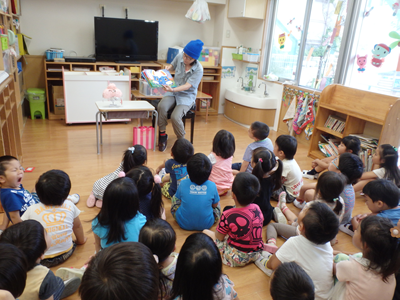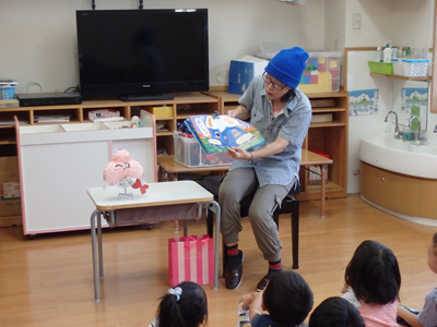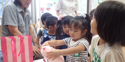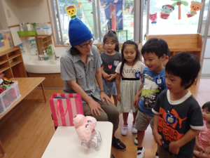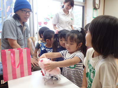 カラフルな袋からピンクのお人形が出てきて、みんな