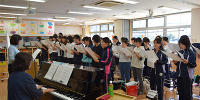 子どもが歌いやすい歌や発声方法、子どもが楽しめる絵本を使った歌等々を、姉妹園の職員と一緒に学びました。