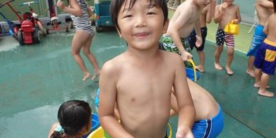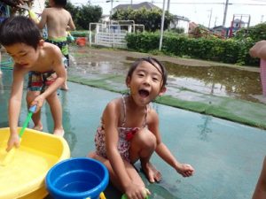 水鉄砲にバケツにジョウロ、水が入る物は何でも遊び道具。
