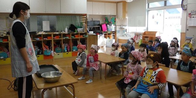調理師の先生からおやきの説明と注意事項を聞きます。