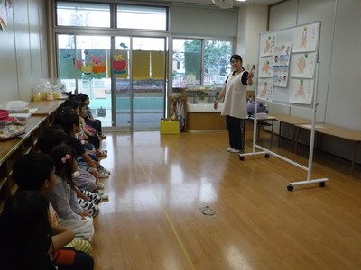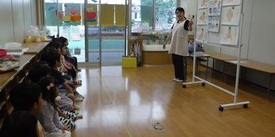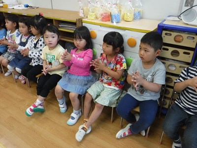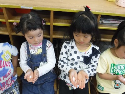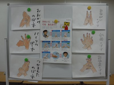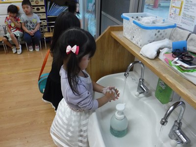 音楽に合わせて歌いながら手洗いの仕方を練習しました。
