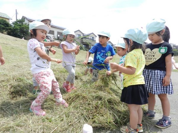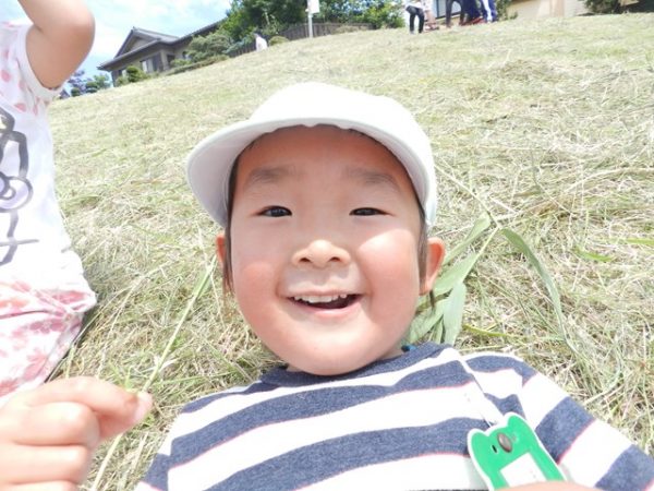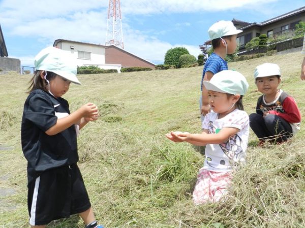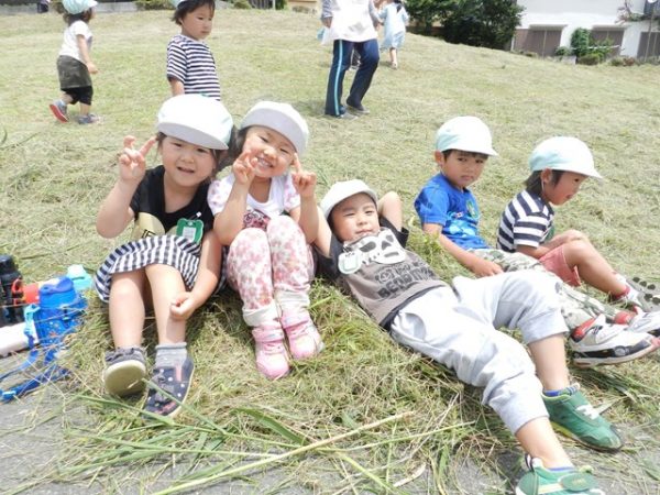刈られた芝がたくさんあったので、みんなで集めてお山をつくっている子もいました。