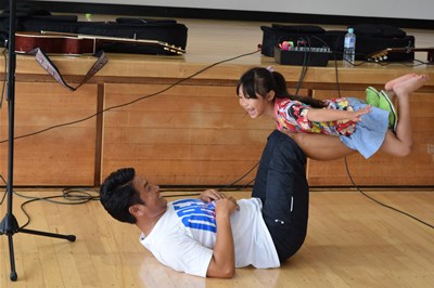 子どもを足の甲に乗せて子どもが飛行機になったり子どもが保護者の方の