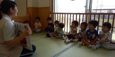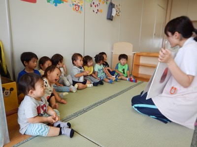お散歩に行く前に大きな「だるまさんが」の絵本を
