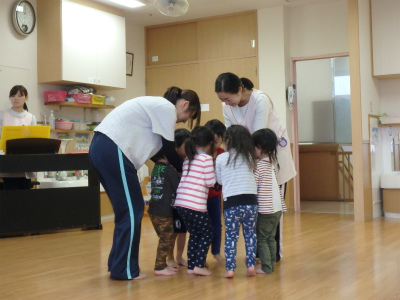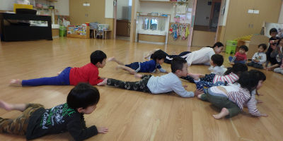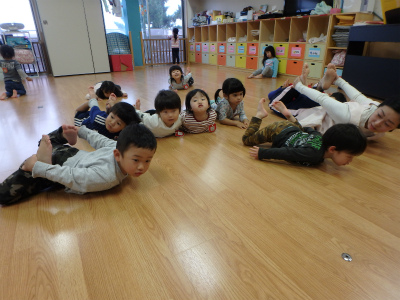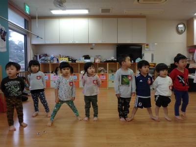 今日イルカ組のお友達は室内でリズムをして体を動かしました!!