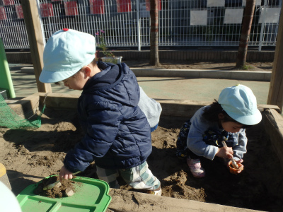 保育部のお友達は砂場が大好きで砂でいろいろなご飯を作って