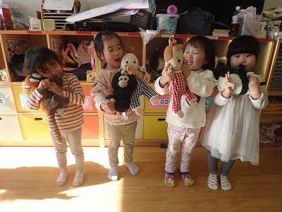 女の子たちはみんなでお母さんになりきり、ぬいぐるみを