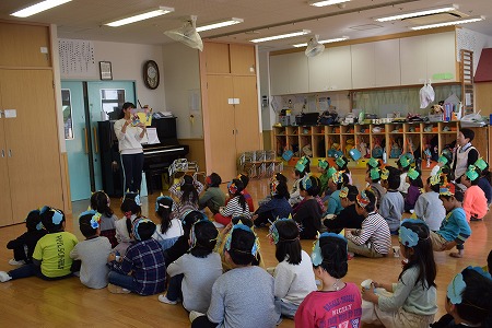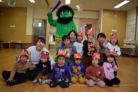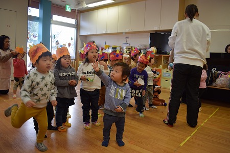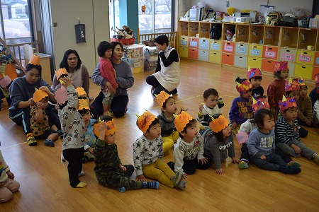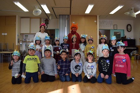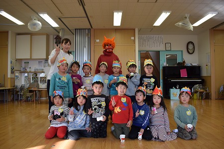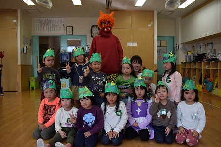 自分たちで作った鬼のお面をつけ、豆を持ち