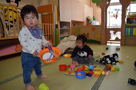カゴいっぱいに食べ物を入れたり、並べたりと思い思いに楽しんでいました!