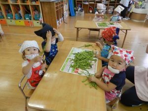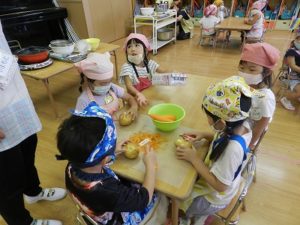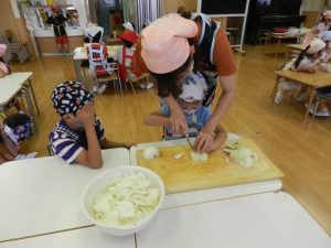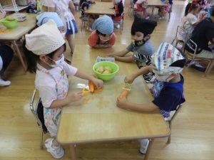 キリン組のお友達が剥いてくれた野菜を切りました!