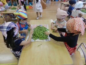 カレーと一緒にだす枝豆を枝から1つずつとりました!!