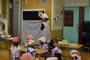 キリン組のお友達はにんじん、じゃがいも、たまねぎを洗い、