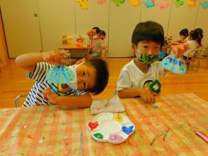 指に絵の具を付けペタペタときのこに模様をつけました♪