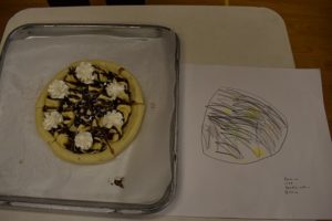 バナナやチョコが乗っている甘いピザなど様々なピザを考えて絵にしました☆