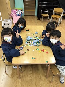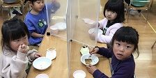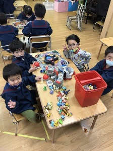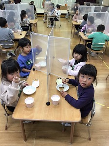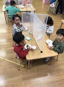 ライオン組のお友達はパンダ、キリン組のお友達の前で
