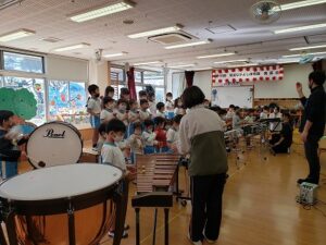 パンダ組のお友達はタンバリンやカスタネットを持ち