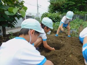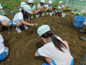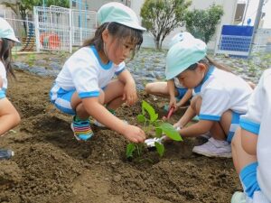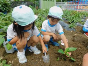 今日ライオン組のお友達はなかよし農園に夏野菜の植え付けを