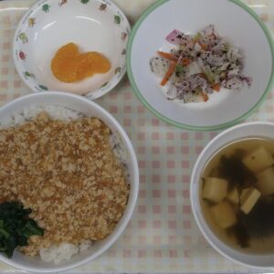 〜今日のお給食〜 ・そぼろ丼 ・キャベツのゆかり和え ・すまし汁(お麩・わかめ・たけのこ) ・みかん 〜今日のおやつ〜 ・牛乳 ・お好み焼き Share this post Share on FacebookShare on Facebook Share on XShare on X Post navigationPreviousPrevious post:6月15日(火)NextNext post:6月16日(水)関連記事12月4日2025年12月4日11月28日2025年11月28日11月27日2025年11月27日11月26日2025年11月26日11月25日2025年11月25日11月21日2025年11月21日
