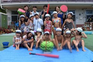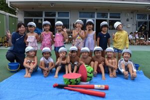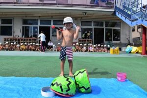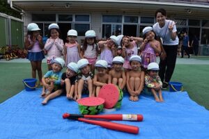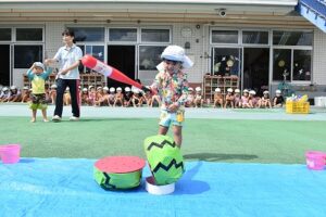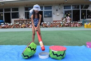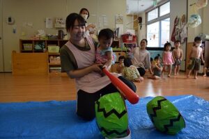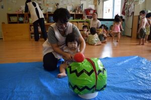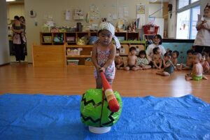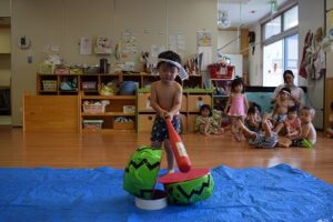 目隠しをして行い、先生達の「もうちょっと右だよ!」などの声を聞いて