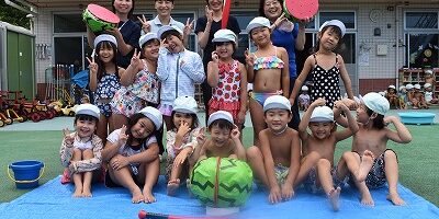 目隠しをして行い、先生達の「もうちょっと右だよ!」などの声を聞いて