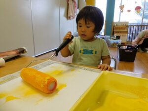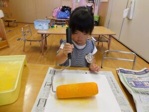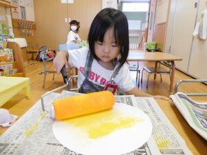 今日イルカ組のお友達は お月見の制作を行ないました! 絵の具とローラーを使って 制作をしていきます! 黄色の絵の具がパーッと広がり 「わー!!」とうれしそうにしていました♪ どんな制作が出来上がるのか 楽しみですね♪ Share this post Share on FacebookShare on Facebook Share on XShare on X Post navigationPreviousPrevious post:9月16日NextNext post:9月17日(金)関連記事12月12日(金)2025年12月12日12月11日(木)2025年12月11日12月10日(水)2025年12月10日12月9日(火)2025年12月9日12月6日(土)2025年12月6日12月4日(木)2025年12月4日