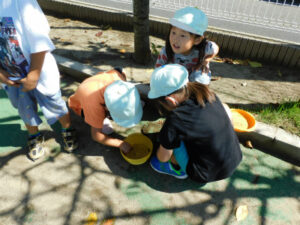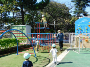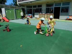 乗り物に乗って遊んだり、先生と一緒に鬼ごっこをしたり