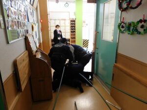 不審者を取り押さえるところまで訓練しました!