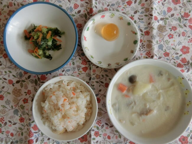 ~今日のお給食~ ・クリームシチュー ・小松菜のごま和え ・キャロットライス ・ミニゼリー ~今日のおやつ~ ・牛乳 ・おいなりさん &…