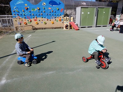 今日はみんなで園庭で遊びました♪ みんなで車や三輪車に乗ると 「レッツゴー!」と園庭を ぐるぐる回って楽しんでいました☆ 鉄棒では前まわりや逆上がりに…