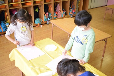 今日キリン組のお友達は 絵の具を使って制作を行ないました♪ 上手に筆を使って 制作を楽しんでいました! 今日から作品展週間として 廊下や階段に子ども達…