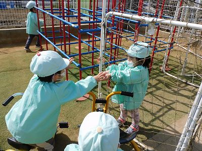 今日イルカ組のお友達は 園庭で遊びました♪ 三輪車や砂場、ボールなどで 遊びました♪ 三輪車に乗っているお友達が マックの店員さんのところに行き、 ドライブスルーでお買い物を楽し…